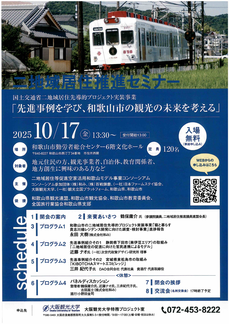本セミナーでは、国土交通省の二地域居住先導的プロジェクト実装事業に採択された和歌山市の取組を中心に、観光の未来を見据えた議論を展開します。 つきましては、ぜひご参加くださいますよう、お願い申し上げます。