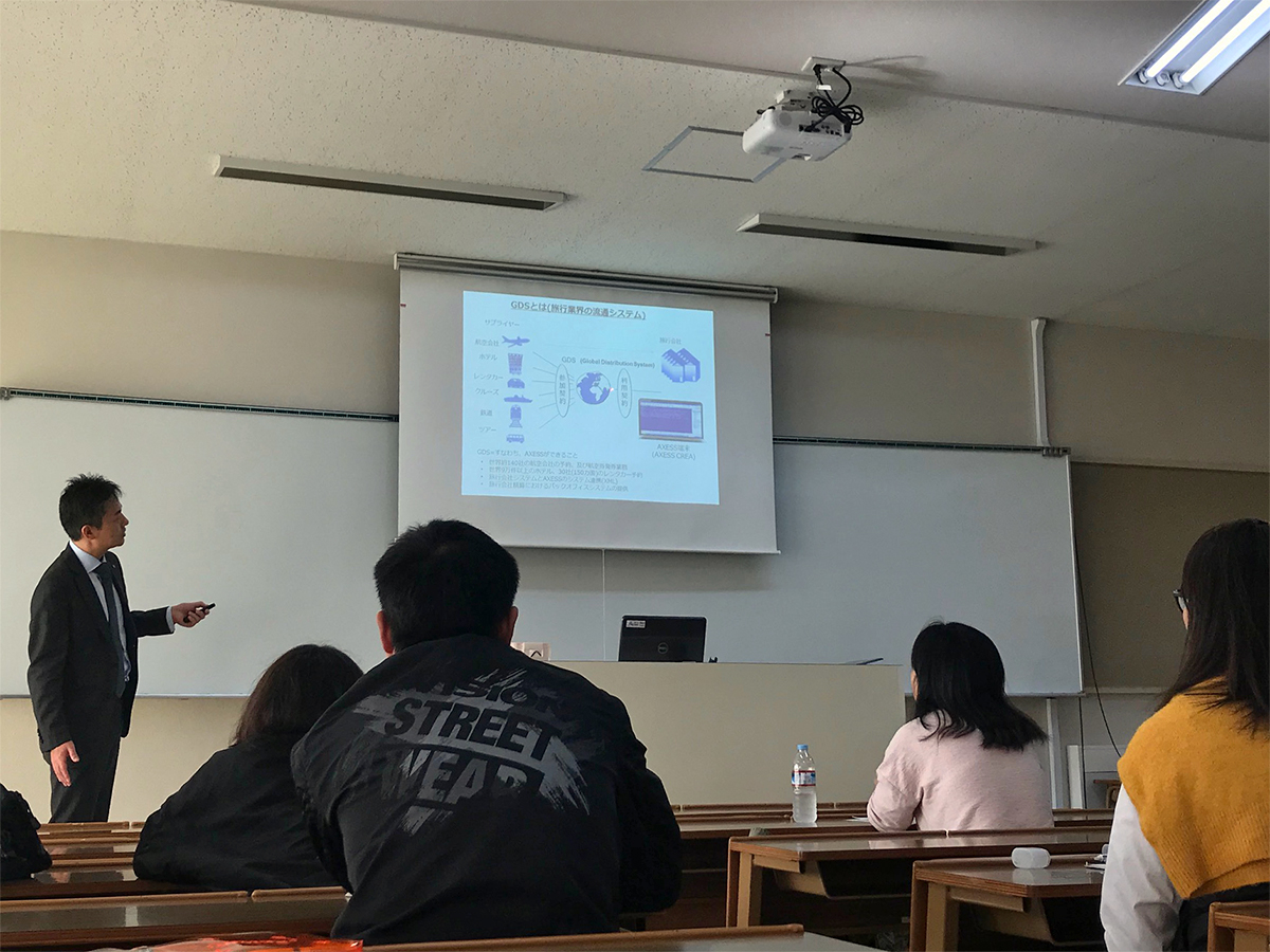 12月4日(金)の航空サービス論(担当:稲本 恵子 准教授)の授業では、株式会社 アクセス国際ネットワーク 様より 山内 光 様と 関澤 留美 様をお招きして、航空業界を含め旅行業界全体の予約システムであるGDS(Global Distribution System)について特別授業を行いました。