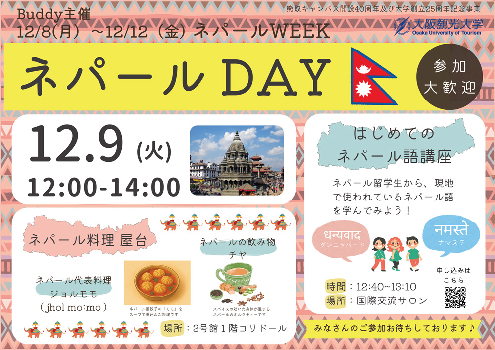 大阪観光大学では、ネパールの文化に触れ、学生・地域の皆さまとの交流を深めるため、「ネパールDAY」を開催します。 当日は、ネパールの人気料理であるジョルモモ(スープ入り餃子)や、スパイス香る本格的なチヤ(ミルクティー)の屋台販売に加え、初心者向けのネパール語講座も実施します。 ネパールの食文化や言語を体験しながら、楽しいひとときを過ごしてみませんか。 ぜひお気軽にご参加ください。