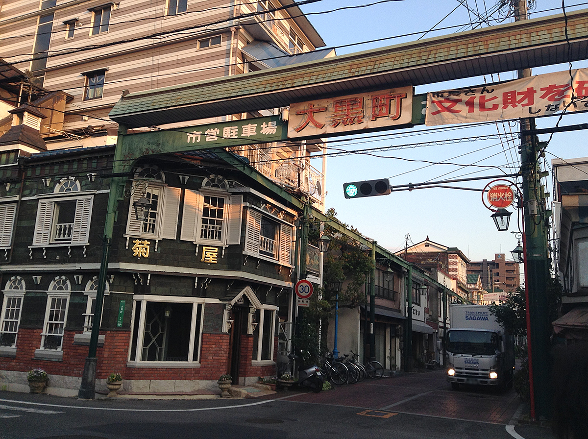 長く福山市に暮らす地元の人たちとの会合を済ませ、はてさて、折角来たのだからと、福山市内を散策して美味しいものでも食べて帰りたいと思った。そこで、どこか、お勧めはないかと尋ねると、「どこかって言われても、なにもない。外国から客人が来ても、鞆の浦や厳島神社まで足を延ばさないと見せるモノがない。食事は自宅で食べることがほとんどで、どこって言われても・・・」と返答に困る。しかしそれでも、しばらく考えて一軒の食堂を教えてくれた。無事に胃袋を満たし、ふと、レジ横の「閉店します」の張り紙に目がいった。その後、駅までぶらぶらと歩いていくと、突然、赤レンガを敷き詰めた、道の両脇にレトロな銀行や交番、イングリッシュパブや時計台を付けた眼科などの洋館が続く、大黒町商店街に迷い込んでしまった。